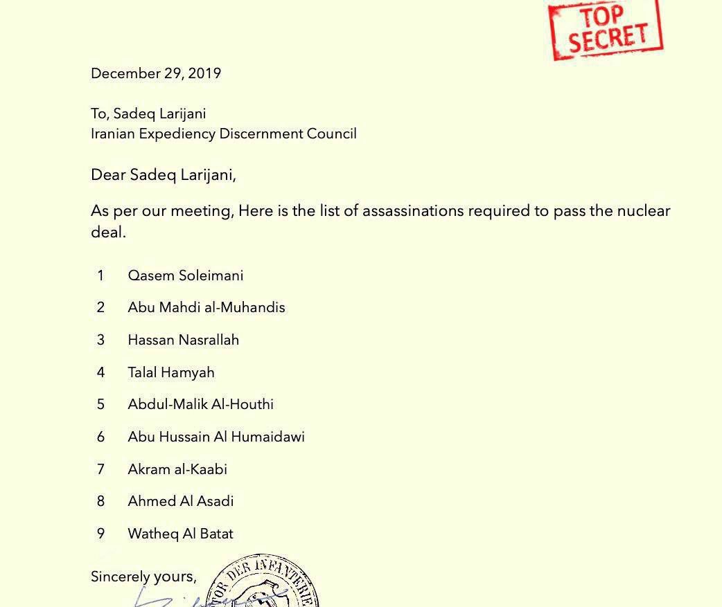وثائق مسربة من السفارة السويسرية في إيران عام 2019 موجهة إلى رئيس مجلس تشخيص النظام في إيران صادق لاريجاني تحتوي على أسماء للتخلص منهم في سبيل المضي قدماً بالإتفاق النووي وهذه الأسماء هي :