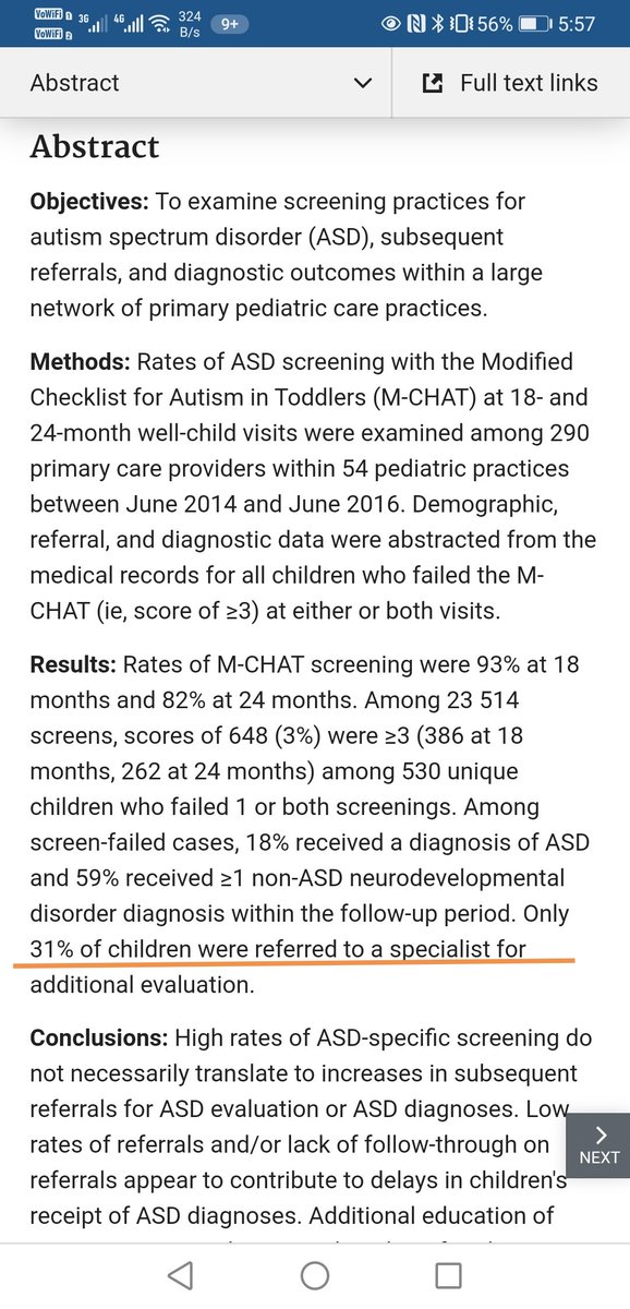 دراسه بالولاية المتحده بينت أن أطباء الأطفال قاموا بتحويل فقط 31% من الأطفال الذين اجرى عليهم مسحM-CHAT وكانت نتيجة المسح بأن الأطفال تظهر عليه أعراض توحد وتم تحويل ثلثهم فقط لتقييم أما الباقي لم يتم تحويلهم على الرغم بوجود أعراض بناء على مقياس pubmed.ncbi.nlm.nih.gov