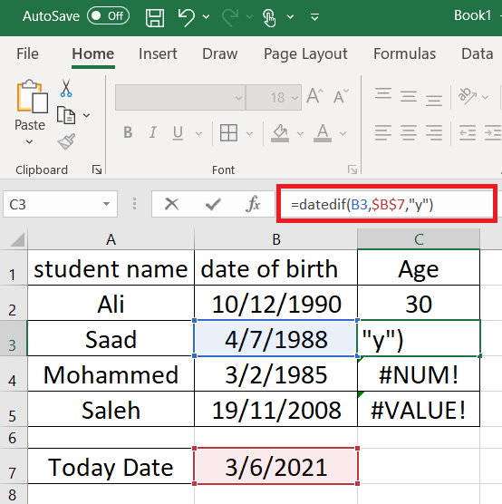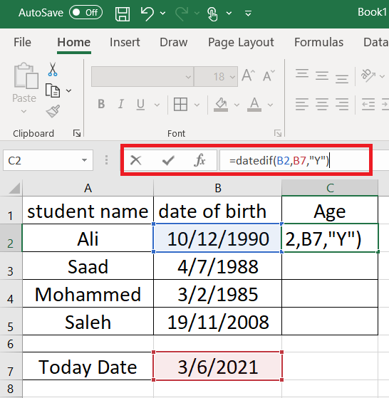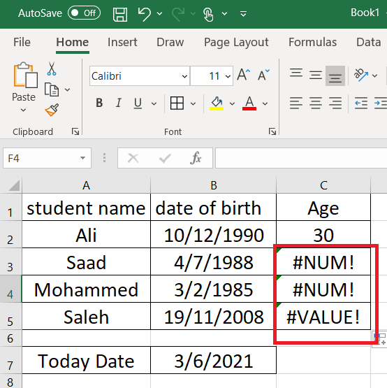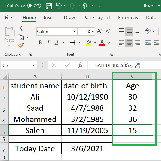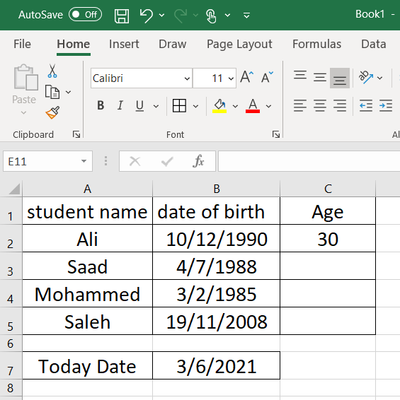 لدينا الجدول التالي يوجد به اسماء الطلاب , وتاريخ الميلاد ونريد حساب العمر من خلال طرح التاريخ الحالي من تاريخ الميلاد , تابع معي
