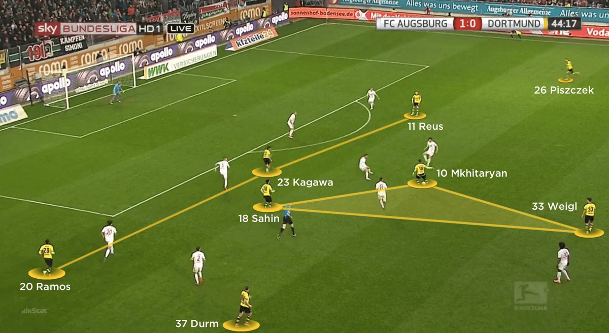 تحت قيادة توخيل يلعب لاعبي خط الوسط الهجوميين أمام لاعب وسط دفاعي واحد وكانوا مؤثرين. حيث كان ماركو رويس يعمل في مراكز متقدمة وكان يتناوب موقعه في الملعب مع كلاً من بوليسيك ومخيتاريان خلف أوباميانغ الذي يظل ثابتاً كمهاجم.