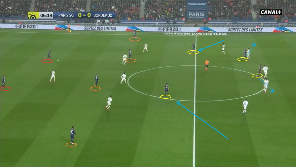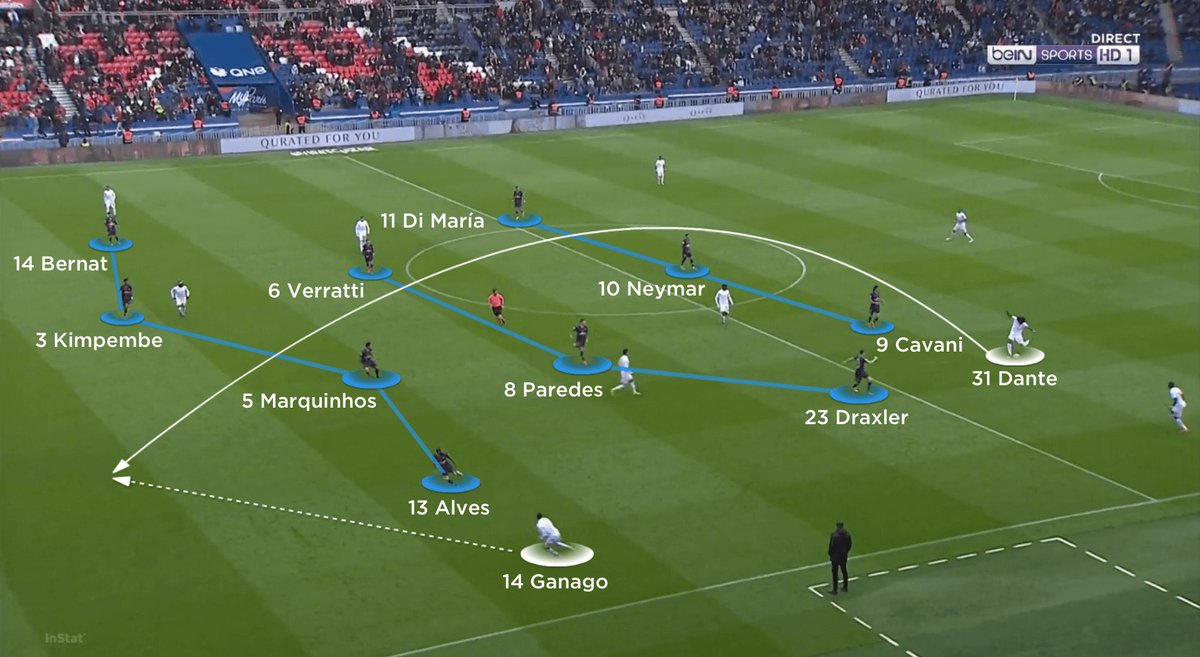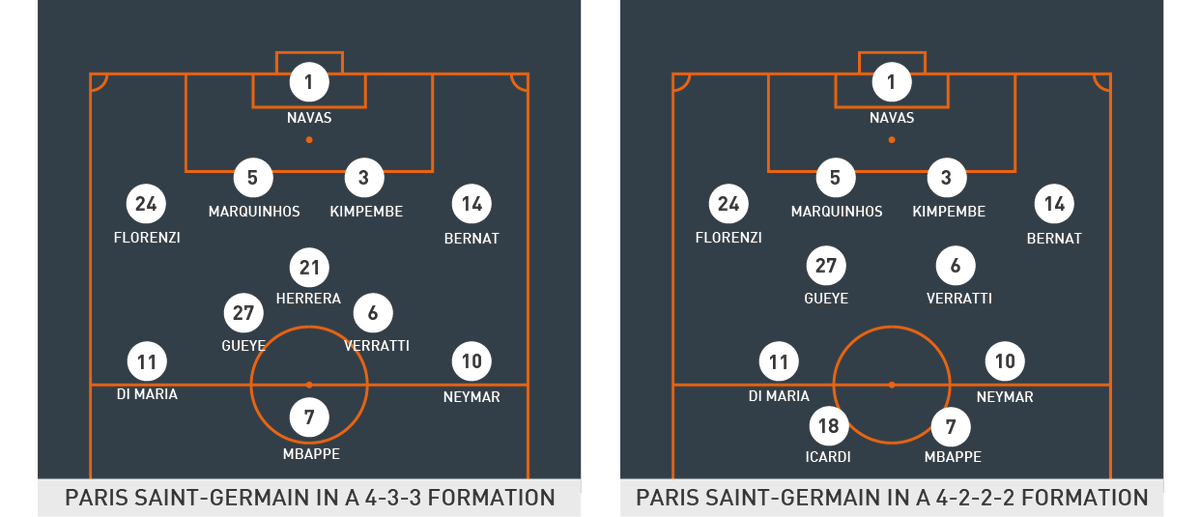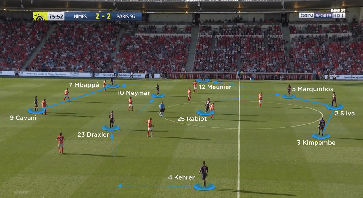 مما شجع نيمار ومبابي وبقية الأجنحة في باريس على البقاء في مواقع مركزية أكثر (أقرب لكافاني). لذلك كان على لاعبين خط الوسط تقديم ديناميكية أكبر وإظهار وعي بالمساحات التي يتركها الأظهرة ومعرفة متى ينسحبون إلى وسط الدفاع ويشكلون ثُلاثي دفاعي مؤقتاً