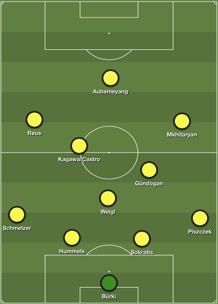 اوباميانغ كان يٌدعم بإستمرار من قبل ثنائي لاعبين على الأطراف وكذلك ثنائي لاعبين وسط من خلفه. قد يتقدم أظهرة دورتموند أيضاً لكنه لم يكن بالأمر الضروري.