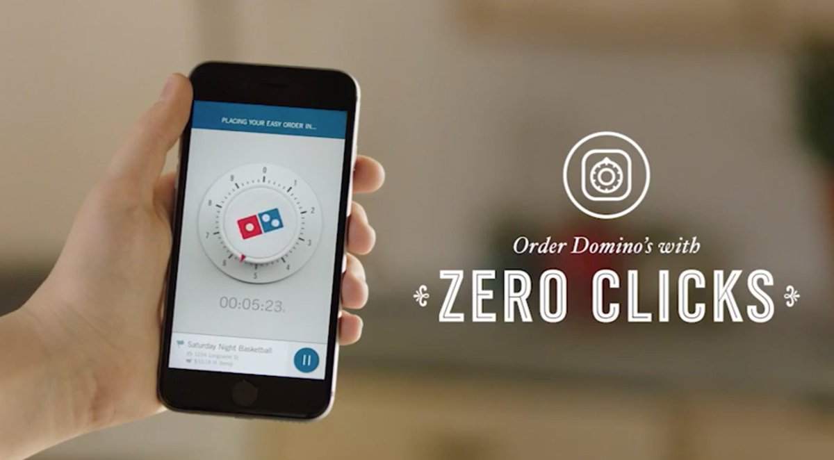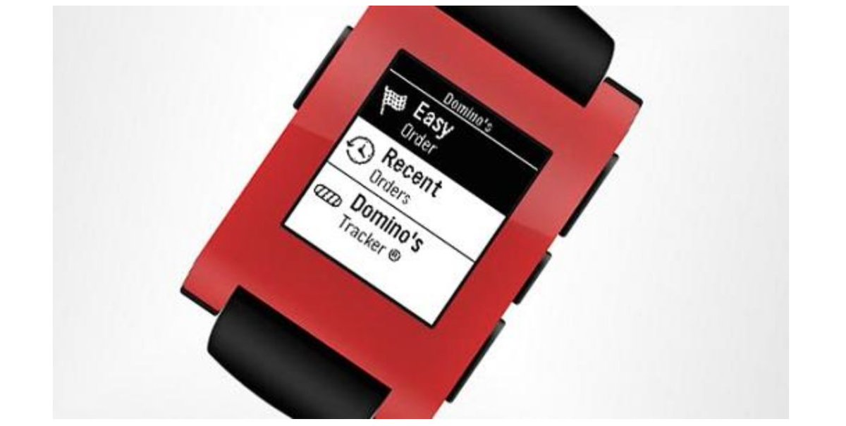 في 2015 استندت دومينوز حقًا إلى حملتهم "في أي مكان" كانت Domino’s أول سلسلة مطاعم رئيسية جعلت الطلب ممكنًا من الساعات الذكية. سمح ذلك للعملاء بتقديم طلبات من الساعات الذكية Pebble و Android Wear ووعد العملاء بأنه يمكنهم "طلب البيتزا من معصمهم بثلاث نقرات حرفيًا".