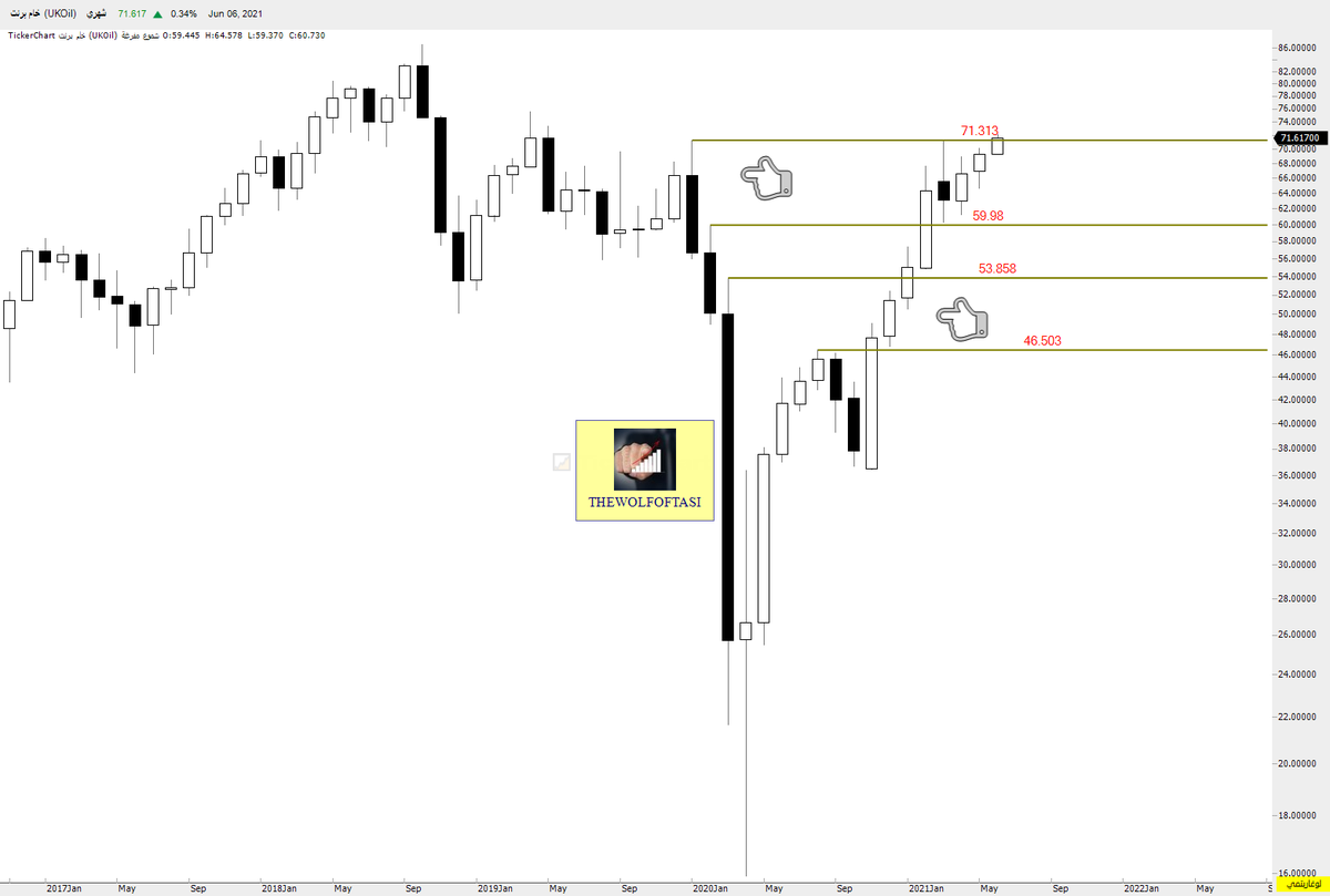 مثال على خام #برنت ونلاحظ كيف يسجل قمم شهرية أعلى من الشهر السابق إلى أن سجل مستوى جديد أعلى في عام ونصف بداية هذا الشهر ..