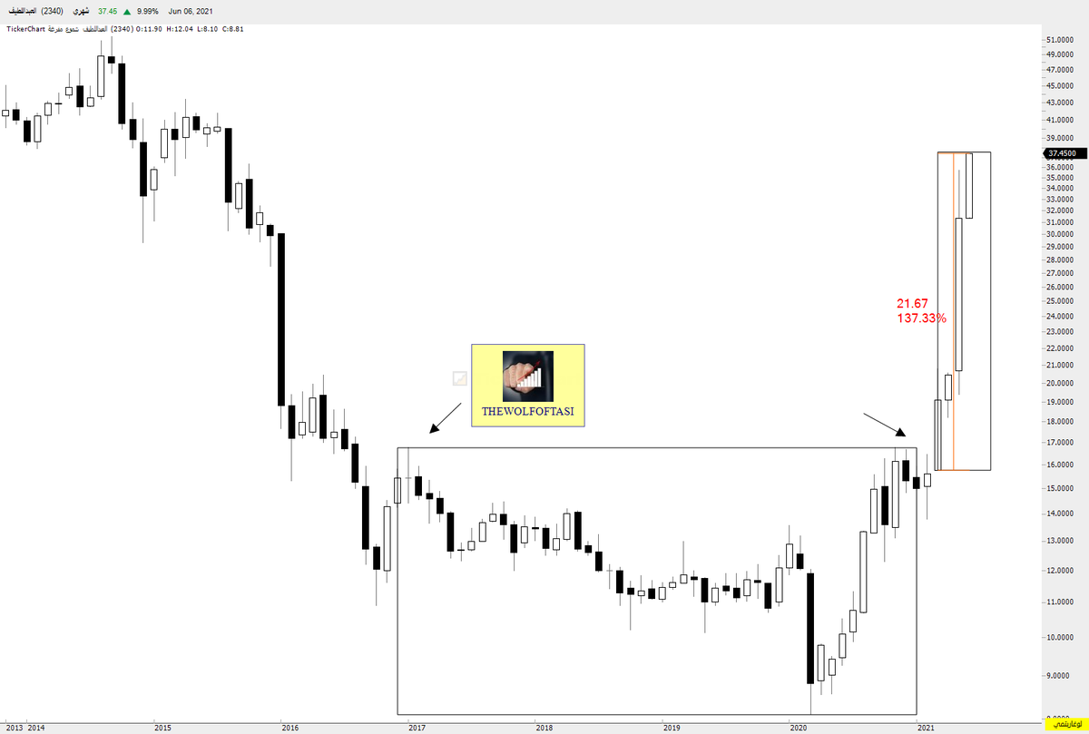 مثال حي من #تاسي لسهم (غثيث) جلس أكثر من 4 سنوات ما بين 9 إلى 17 ريال وبعد ما أخترق مستوى الـ 17 في 3 أشهر و 6 أيام (دبل السهم وزيادة ) وذلك بارتفاع 137% ولا فيه خبر جوهري ولا نتائج ولا توزيعات ..