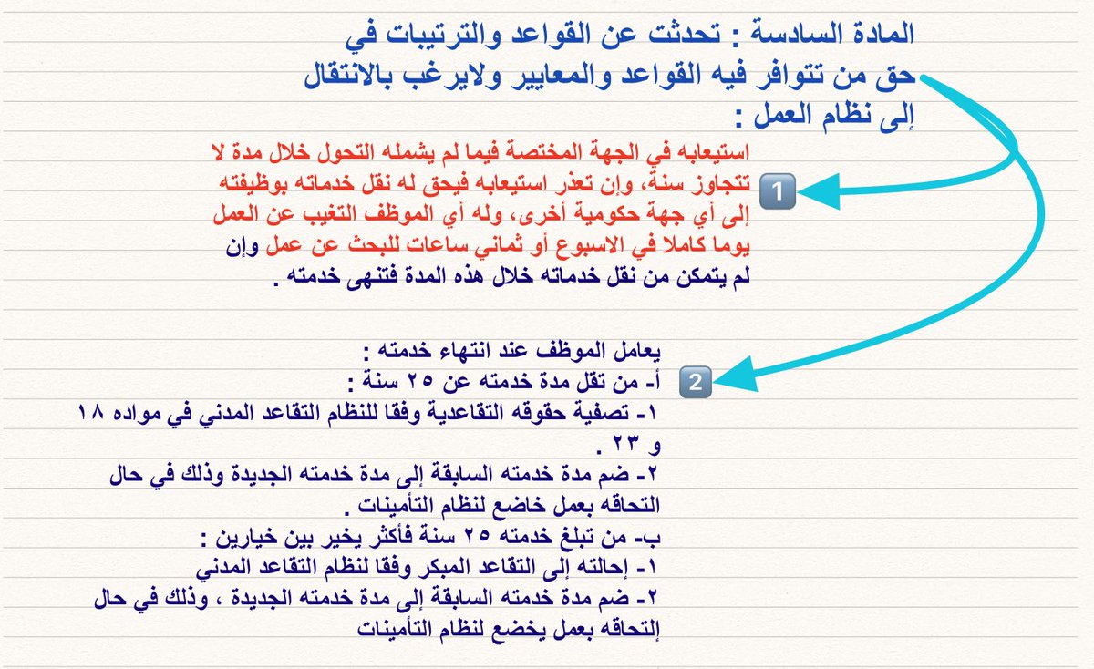 المادة السادسة : تحدثت عن القواعد والترتيبات في من تتوافر في القواعد والمعايير للتحول ، ولا يرغب بالانتقال إلى نظام العمل