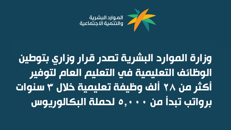 وزارة الموارد البشرية تعلن قرار وزاري بتوطين #الوظائف_التعليمية في منشآت التعليم العام (الأهلية والعالمية) بهدف توفير (28) ألف وظيفة برواتب لا تقل عن (5,000) كحد أدنى في كافة المناطق.