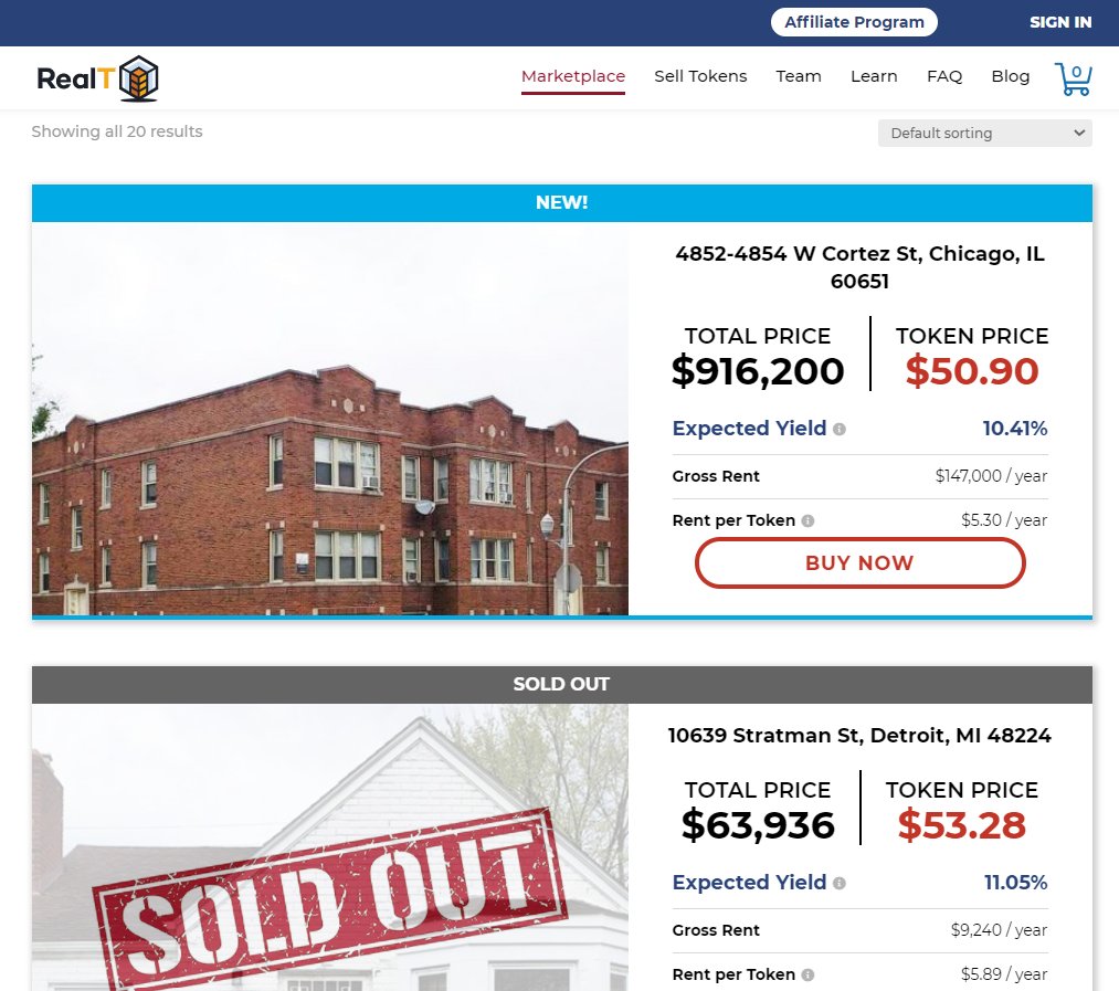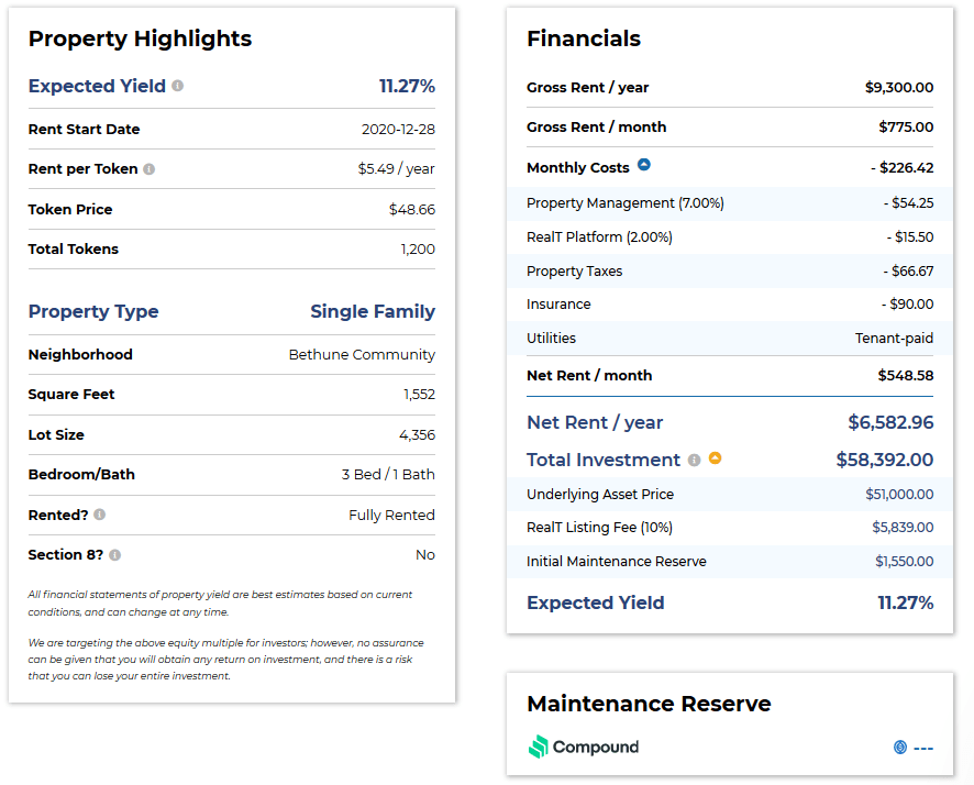 En 2019, RealT fractionnait la maison "9943 Marlowe" pour environs 63$ par token, acheté par une centaine d'investisseurs.