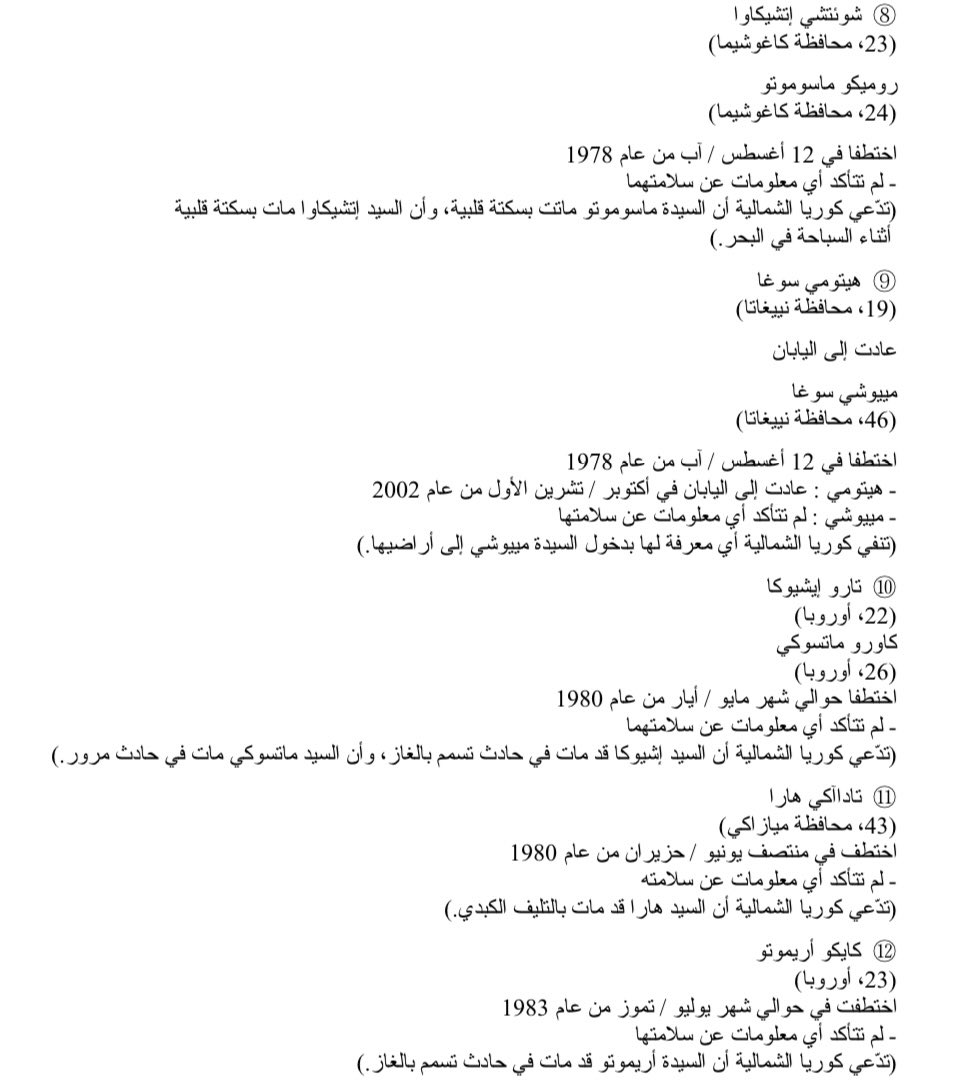 هذه هي قائمة بأسماء ومعلومات المختطفين الذين حددتهم الحكومة #اليابانية بالإضافة إلى أوضاعهم الحالية وفق ما ادعت عنه كوريا الشمالية عن أسباب وفاة البعض منهم كالحوادث المرورية أو تسمم غاز أو وفاة طبيعية أو انتحار بالرغم من عدم تصديق الجانب الياباني لهذا الأسباب لعدم وجود أدلة دامغة