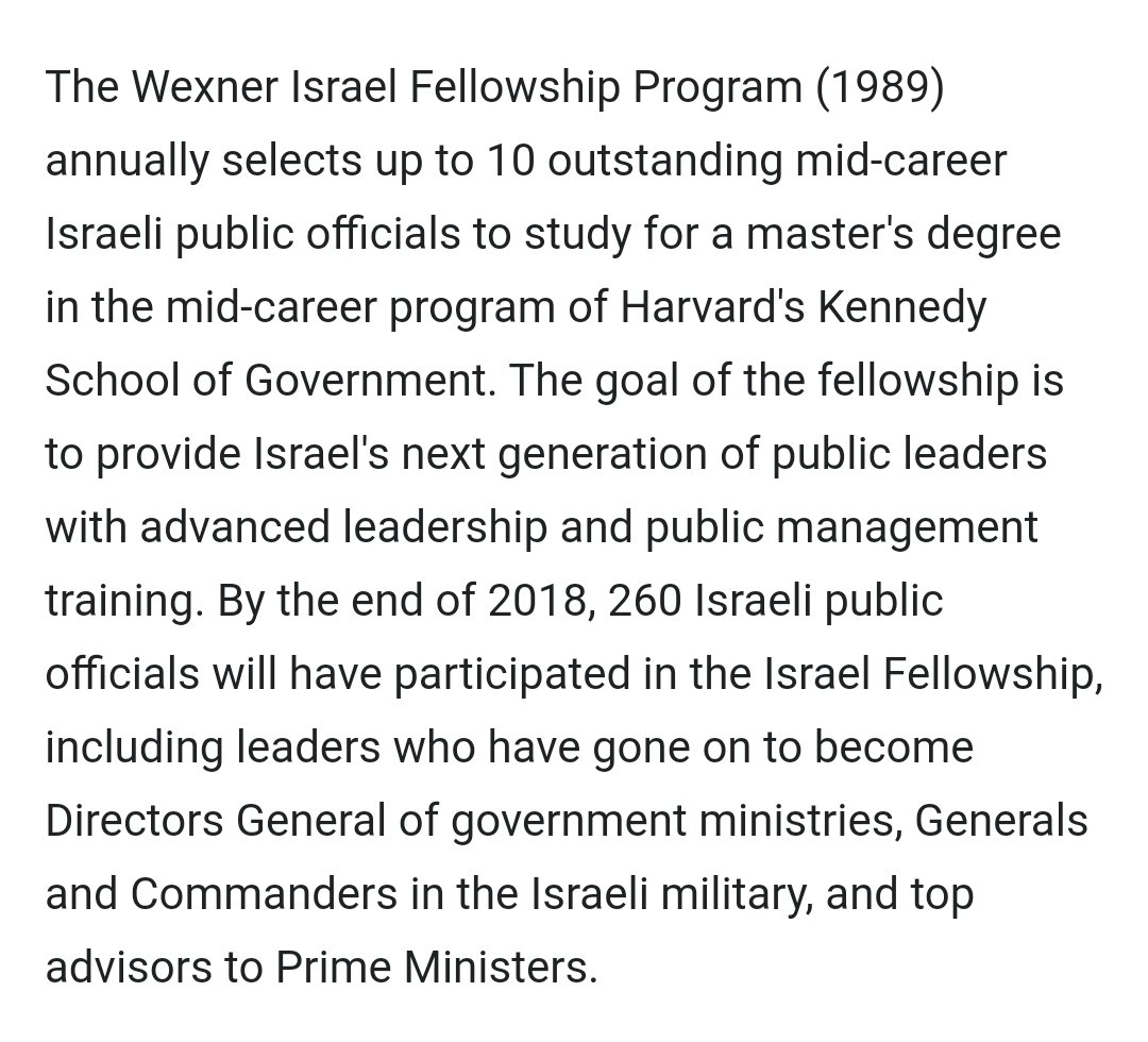 والمذكور إن بنهاية 2018 فيه حوالي 260 مسئول في حكومة الكيان شاركوا في الزمالة دي، بما فيهم مديرين في الوزارات وجنرالات وقادة في الجيش الصهيوني وكبار مستشارين لرؤساء الوزراء
