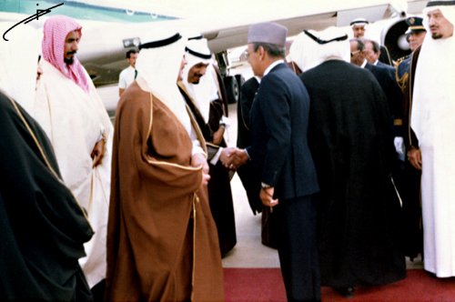 جلالة الملك خالد بن عبدالعزيز ينزل من الطائرة في إطار زيارة جلالته لأمريكا يرافقه سمو الأمير سلطان بن عبدالعزيز، ويبدو الشيخ ناصر الشثري، عام 1978م