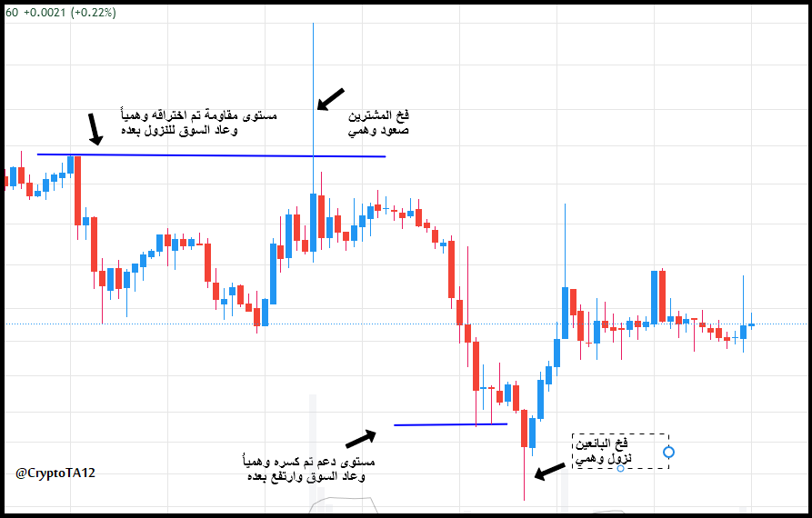 ويحدث عن حصول نزول خفيف قرب القمة فيقوم الصناع بأختراق مستوى المقاومة لموجة النزول و يوهمون المتداولين بأن السوق سيرتفع للأعلى