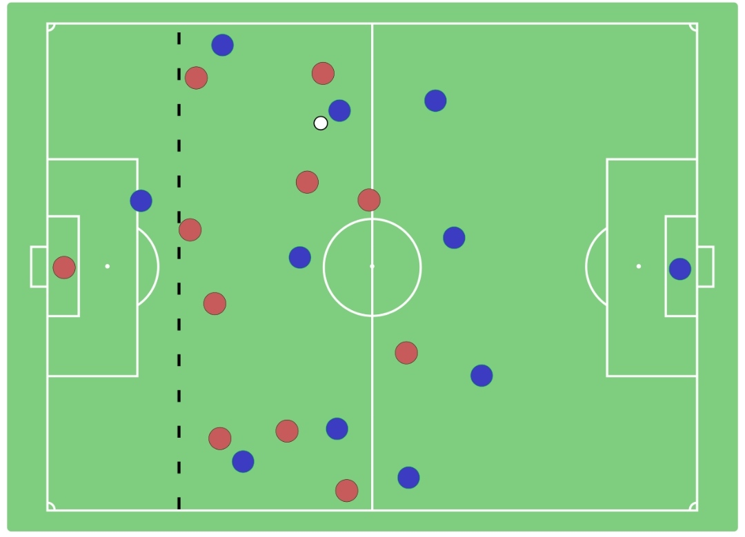 ⬅️يعتبر اللاعب الازرق مرتكباً للمخالفة إذا تم تمرير الكرة له في هذه اللحظة، سواءً أكان في موضع تسلل عند استلام الكرة أم لا.