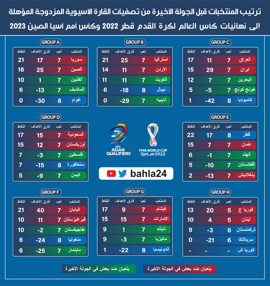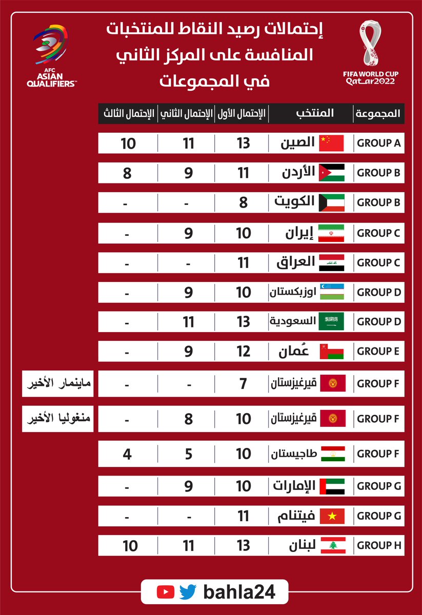 المركز الثاني بين العراق وإيران، (البحرين حسابياً ممكن تصل لكن بشرط خسارة إيران وفوز البحرين على هونج كونج بعدد كبير من الاهداف).