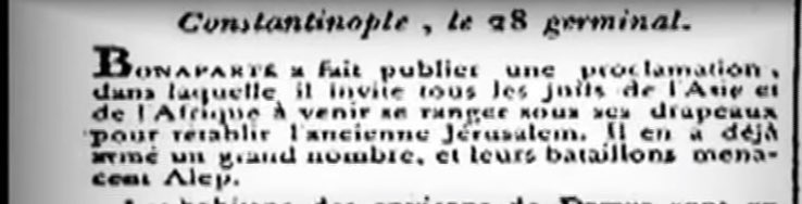 عام ١٧٩٩ عندما استعصى جيش نابليون بونبارت إجتياز أسوار عكّا وجّه نداءً ليــهود العالم قائلًا : " أيها الإسرائيـليون إنهضوا فـ هذه هي اللحظة المناسبة ، إن فرنسا تقدم لكم يدها الآن حاملة إرث اسرائيــل سارعوا للمطالبة باستعادة مكانتكم بين شعوب العالم "