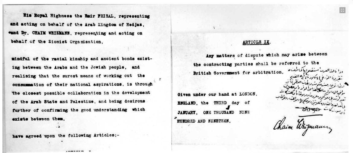 جاء في الوثقية : " الوقت الراهن ليس مناسبًا لإنشاء الدولة اليهـودية المستقلة لذا يجب أن توضع فلسطين بعد الحرب تحت السيطرة البريطانية ".