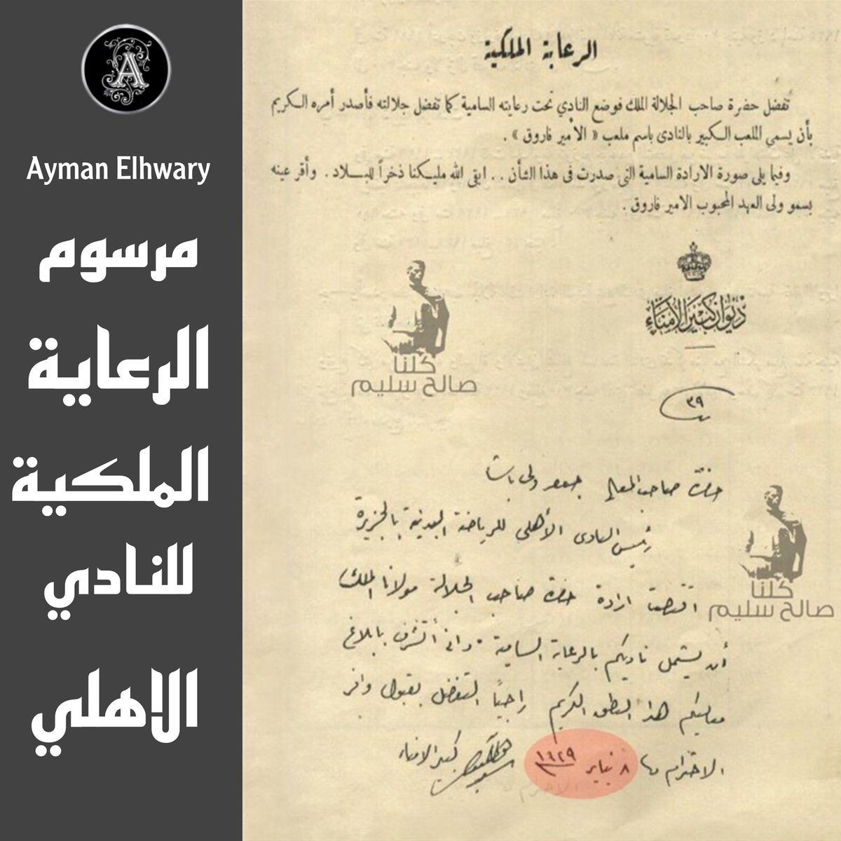 ٥٥-((وهنا نجد أيضا أن الملك هو الذي عرض الرعاية وأصبح اللقب الملكي للأهلي ..وبعدها بسنوات وبالتحديد عام 1941 تقدم حيدر باشا وزير الكلية الحربية ورئيس القلعة البيضاء وقتئذ جلالته للمختلط وقام بتغيير اسم النادى من المختلط إلى "فاروق"