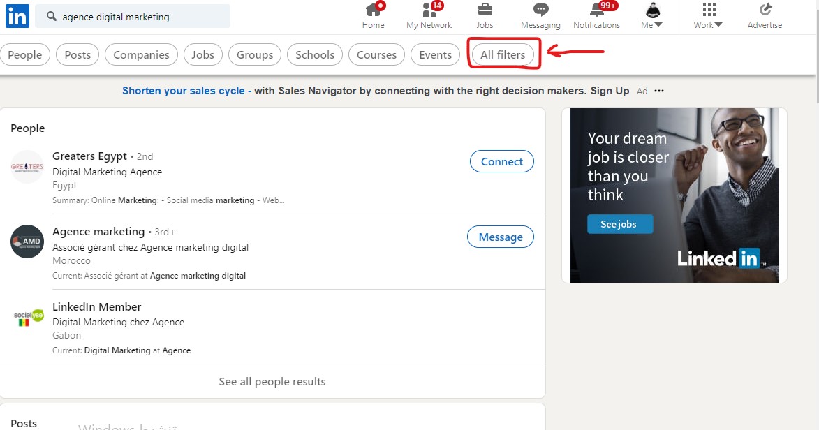 انتقل الى لينكدان واكتب " Marketing Agency " (مجرد مثال):
