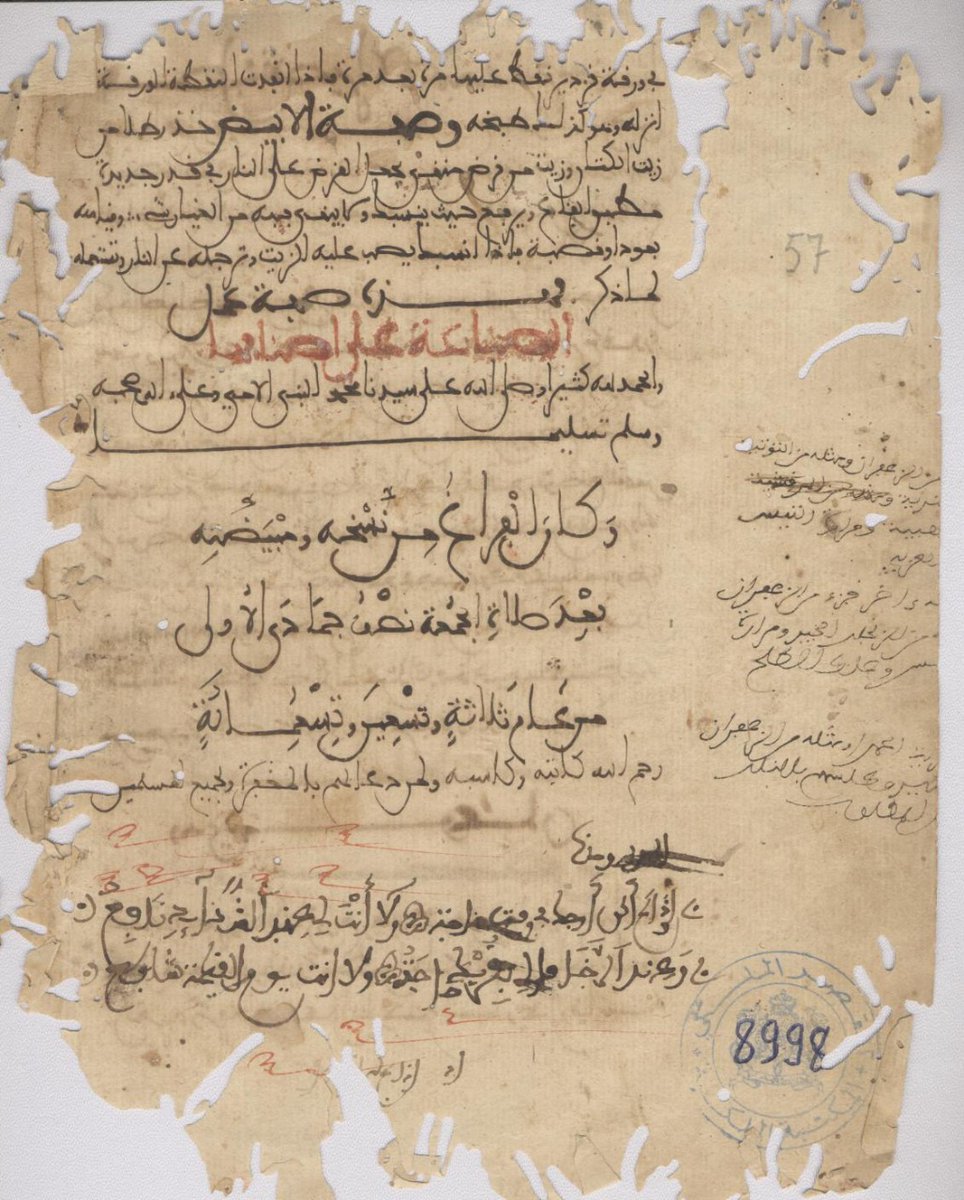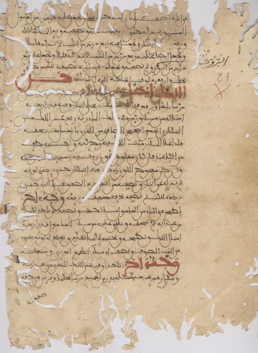 15-وتنتشر الرطوبة في نصفها الأول ، مع بعض المحو وثقوب الارضة . وفي حواشيها طرر وإفادات ووصفات مهمة تتصل بموضوع الكتاب وتزيده إثراء بعضها لا يقرأ لرداءة الخط والانطماس ، وهي كما يبدو إضافات منقولة من كتب مشابهة أخرى .