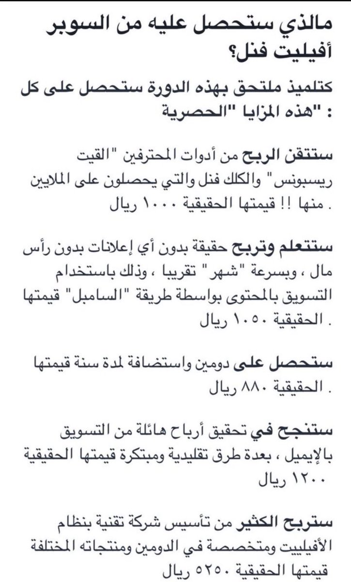 ❌ إذا كنت تعاني من مشاكل مالية "لاتجد أساسيات الحياة" ، لاتشترك في هذا البرنامج ، السوبر أفيليت فنل هو برنامج تدريبي يهدف لتدريبك على التسويق بالعمولة ، الرجاء الشراء إذا كان يناسب "ميزانيتك" فقط ، لاتقترض من أجل الشراء .