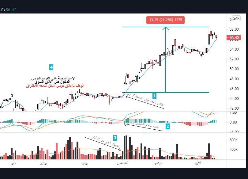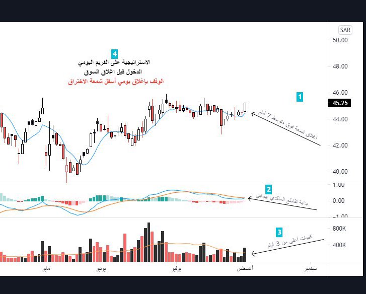الاستراتيجية تكون على الفريم اليومي والدخول قبل الاغلاق اليومي للتأكيد ان الشمعة اغلقت فوق متوسط ٧ ايام الوقف يكون بلإغلاق اسفل شمعة الاختراق