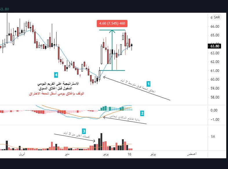 ملاحظة : مو شرط السهم يرتفع بعد التقاطع مباشره ممكن يأخذ وقت من ٤ ايام الى ٧ ايام بمسار عرضي فوق متوسط ٧ ايام لذلك اذا لم يكسر وقفك عليك بالصبر فقط