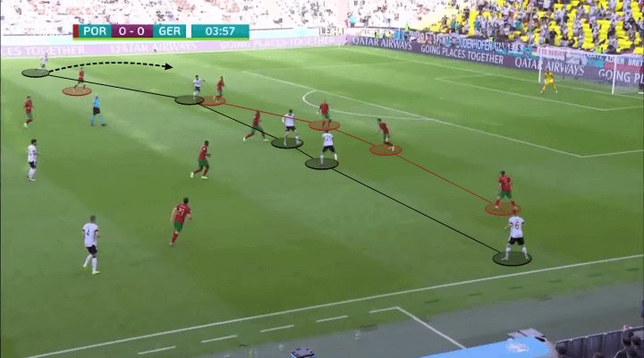 الفريق الذي يكافح بشدة لتتبع ظهير الجناح المعارض غالبًا ما ينتهي به الأمر بالتحول إلى دفاع مكون من خمسة لاعبين ، لكن من الصعب تذكر سانتوس باستخدام هذا النظام مع البرتغال واستمر في قلب الأربعة طوال هذه المباراة.