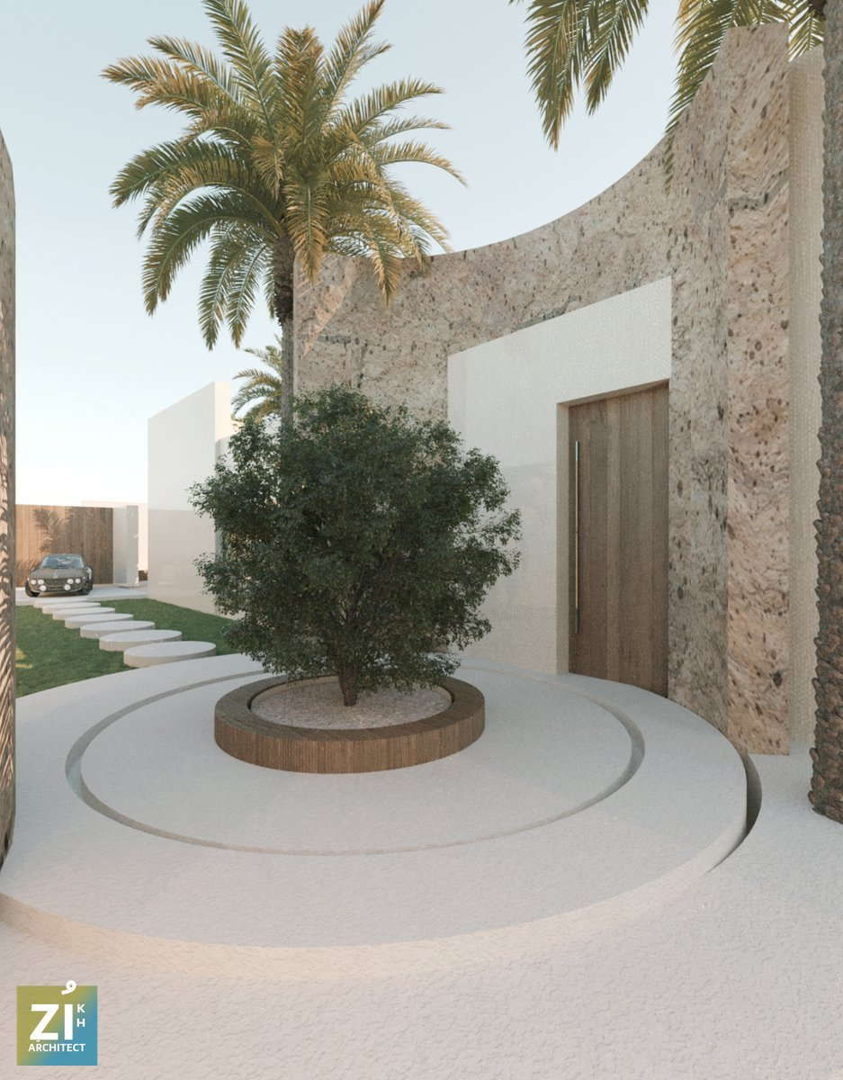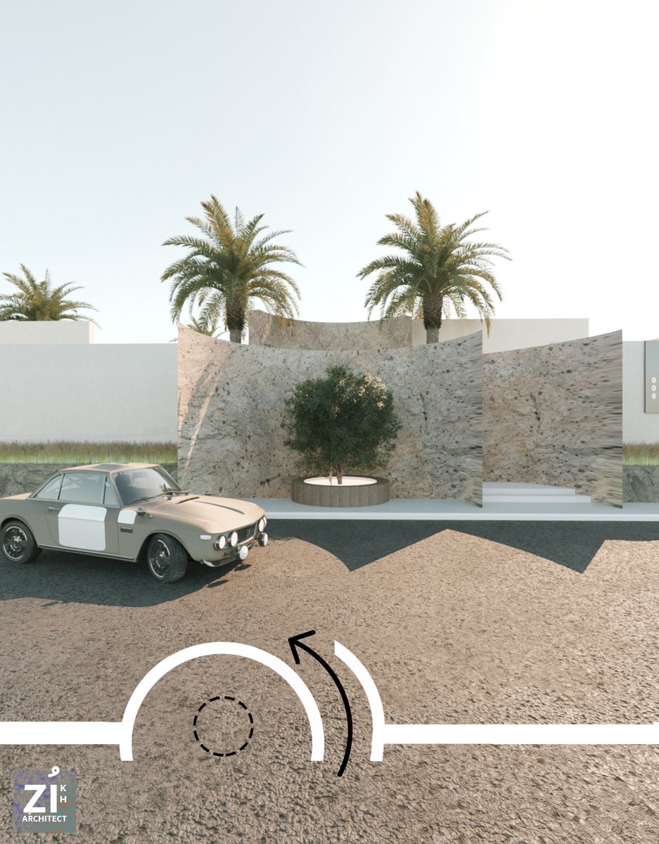 اعطينا مدخل الضيوف قوة بوضع المنحنى لتأكيد المدخل كما اضفنا عنصر لاند مارك للمدخل ووضعنا بعض الدراسات التي تأسست منه المشروع ارجوا الاطلاع لفهمها شكرا لكم