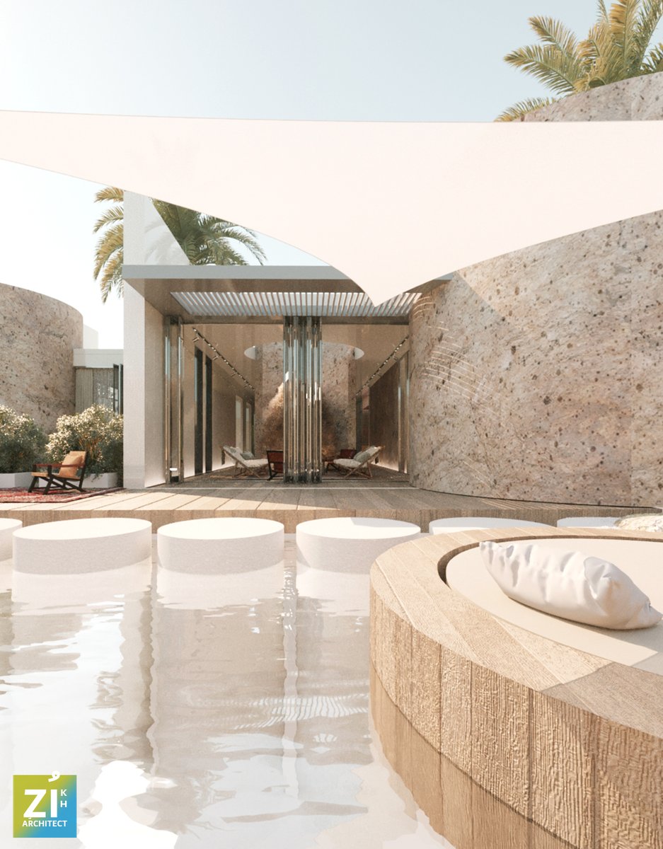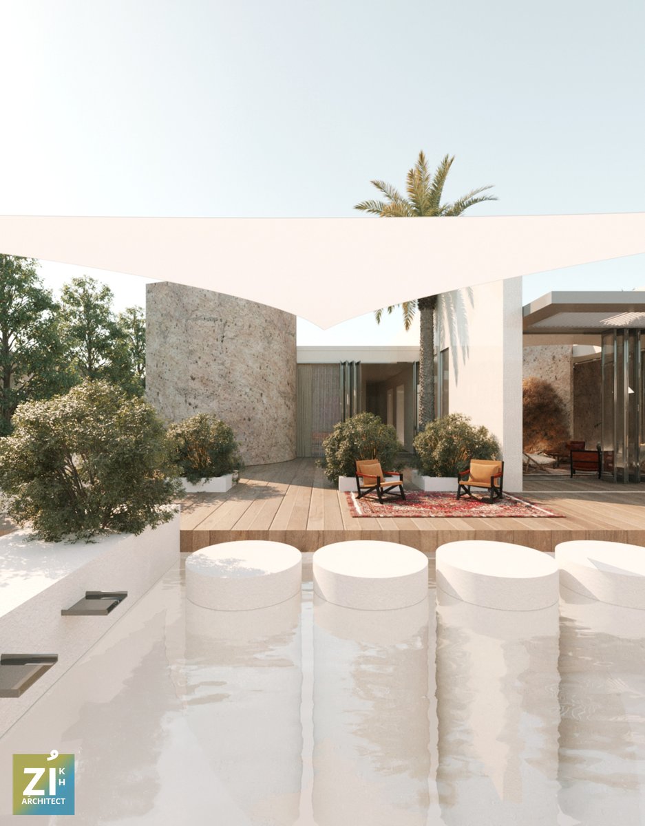 كما استخدمنا مظلات الاشرعة لتتماشى مع المنحيات واعطاء اسقاط ظل بشكل جميل ووضعنا جلسة ارضية تطوف بالمسبح ووزعنا بعض الاشجار المحلية بالمشروع .. ركزنا على اطلالات العائلة بحيث اعطيناها اطلالات ذو 16 متر
