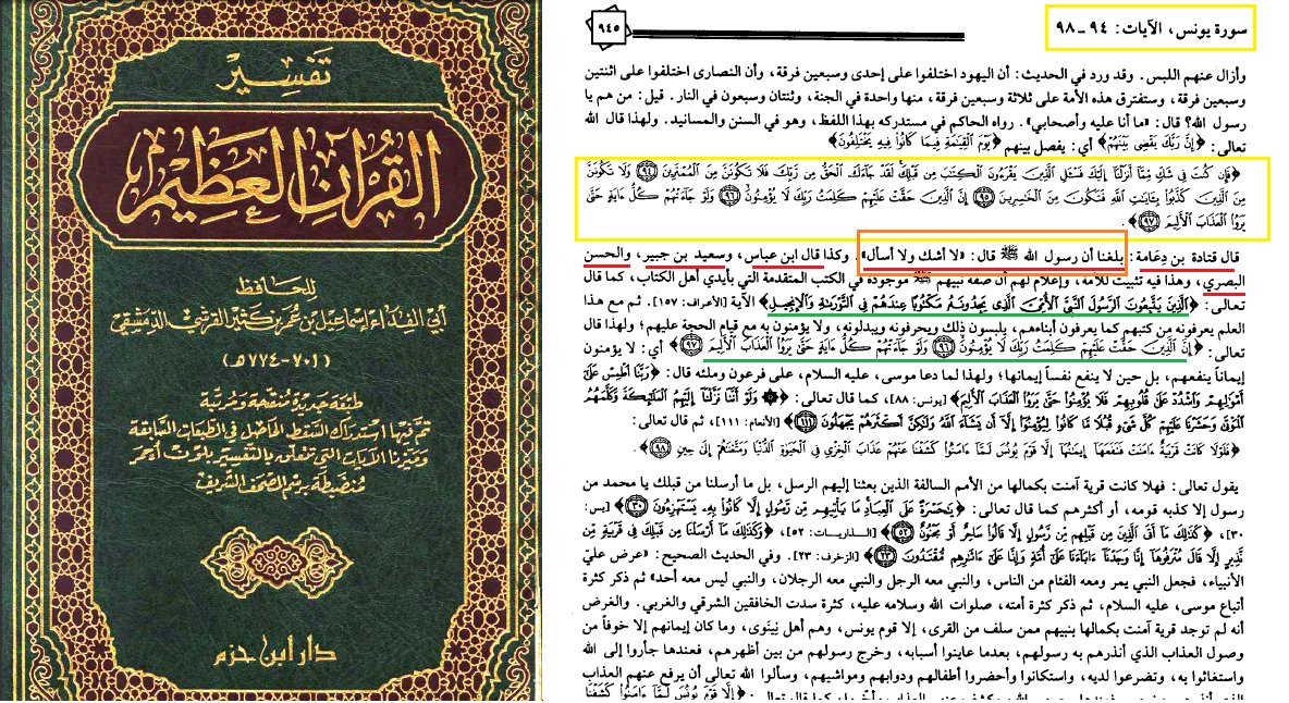 أشكلت الاية "في الصورة المرفقة" على كثير من الناس وأورد اليهود والنصارى على المسلمين فيها ايراداً وقالوا: "كان في شك فأُمر أن يسألنا"