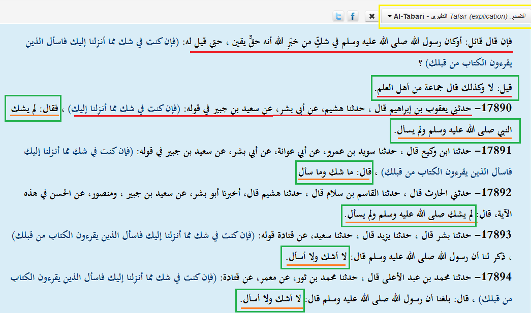 وقد أجاب الطبري في تفسيره على سؤال أو كان رسول الله في شك من خبر الله؟بلا،(وكذلك قال جماعة من أهل العلم) ونقل أقوال أهل العلم "في الصورة المرفقة"
