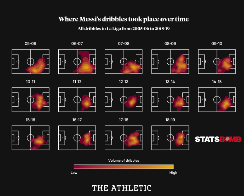 باستخدام بيانات من @StatsBomb وإحصائيات ليونيل ميسي، والتي تغطي موسم ظهوره الأول حتى نهاية 2018-19 ، اختار ذا أثليتيك 10 عناصر مختلفة من اللعبة التي برع فيها ميسي، في أوقات مختلفة من حياته المهنية، لإظهارها مدى اتساع إتقانه لكرة القدم.