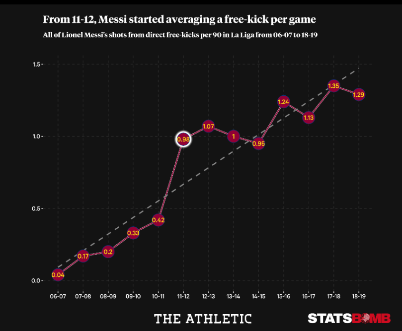 يعود التشابه مع رونالدينيو عند النظر إلى البيانات الأحدث - حيث يتحسن مع تقدم العمر، سجل ميسي 12 هدفًا من الركلات الحرة في عامي 2017 و 2018 و 2018-19.