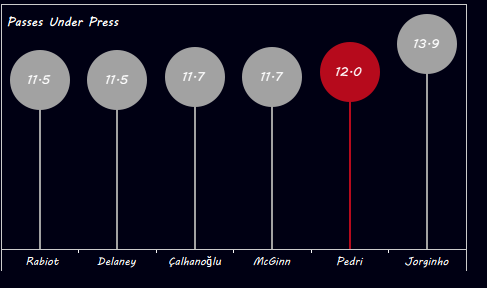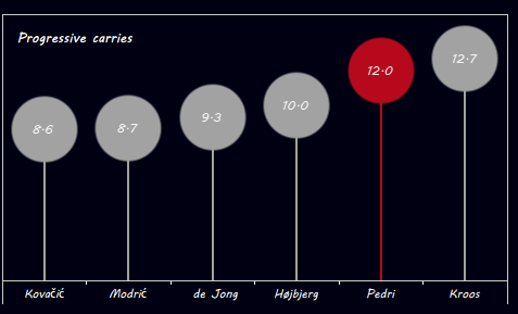 الغير طبيعي كما أشرنا مسبقاً أنه يراكم أرقام لاعب إرتكاز و ليس ميزالا (8) فالركض الإيجابي بالكره يتطلب أن يكون اللاعب أما يتوافر له المساحات و ضغط منخفض أو أن يكون اللاعب صاحب مهارات تكنيكيه عاليه و قادر علي التصرف بذكاء في المساحات الضيقه و هنا إنريكي قد وجد ضالته في بيدري..