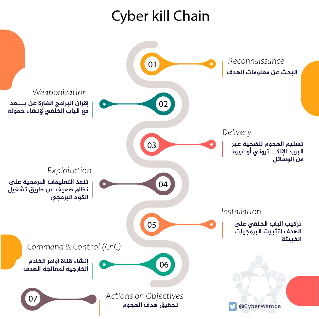 تظهر الخطوات في Cyber Kill Chain في الانفوجرافيك