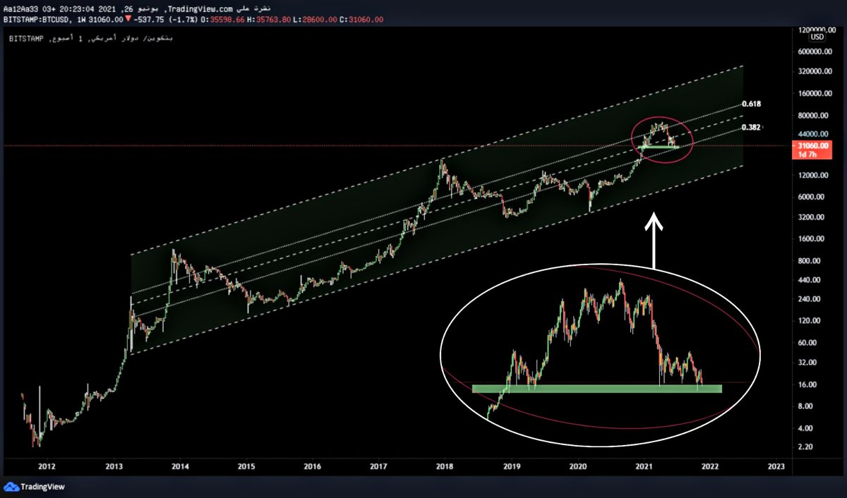 #البتكوين من عام 2013 في قناة صاعدة كبيرة ( اتجاه صاعد ويتخلله بعض التصحيحات الكبيرة ويستمر بالصعود اضعاف الهبوط ) ارسم الشارت عندك وشف التصحيحات القوية ايش يصير بعدها .