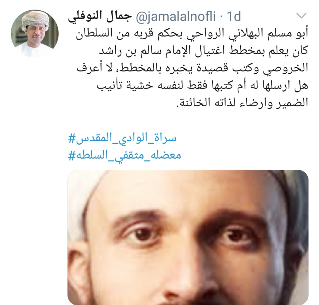 ٥) وعندما ننظر في المعطيات التحليلية لهوفمان، والظرفية التاريخية لا نستبعد التحليل الذي قدمه النوفلي، من حيث إن التدبير للقضاء على الإمامة بدأ من زنجبار حيث يعيش البهلاني، وحيث إنه من حاشية الحكم وله نوازع متناقضة، وهو شخصية تاريخية وليس من ممتلكات أحد من الناس حتى يهدد بالسجن