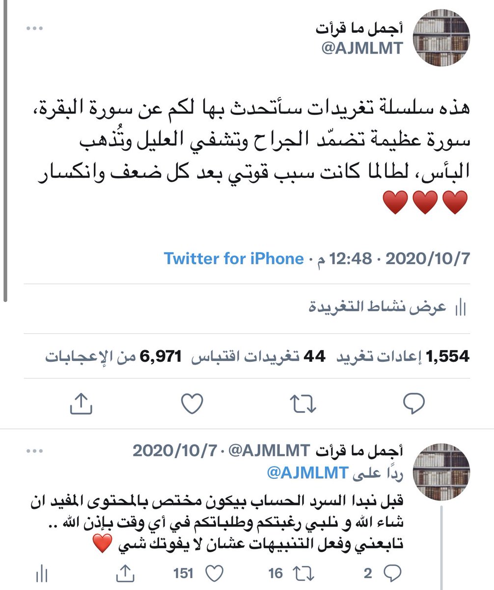 هذه سلسلة تغريدات سأتحدث بها لكم عن سورة البقرة، سورة عظيمة تضمّد الجراح وتشفي العليل وتُذهب البأس، لطالما كانت سبب قوتي بعد كل ضعف وانكسار ♥️♥️♥️