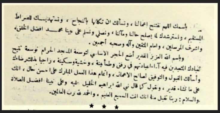 ونشهد بك للصراط المستقيم، ونسترشدك بما يصلح حالنا ومآلنا، ونصلي ونسلم على نبينا محمد، أفضل الخلق، وأشرف المرسلين، وإمام المتقين، وآله وصحبه أجمعين، وباسم الله العزيز القدير أضع الحجر الأساسي لتوسعة المسجد الحرام، توسعة تتيح لعبادك المتعبدين فيه أداء عبادتهم في رفق وطمأنينة،