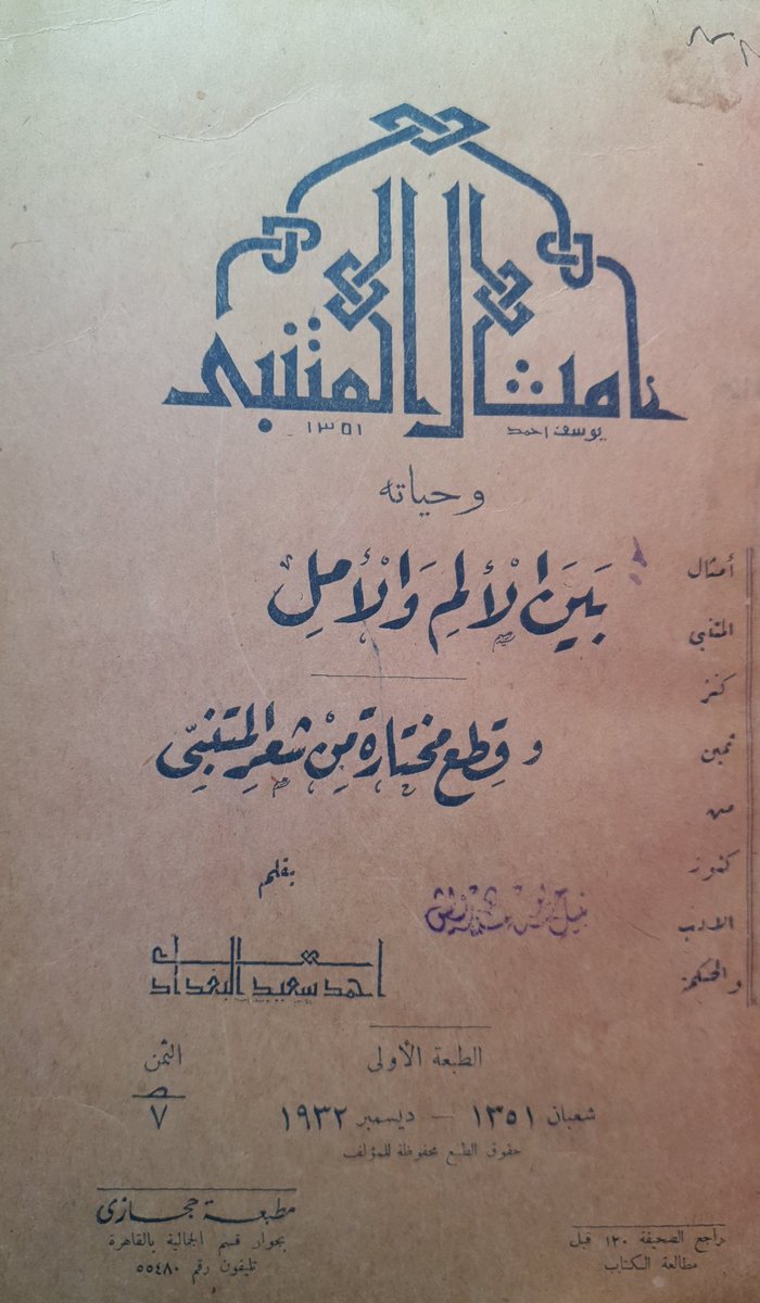 ٩- ابن أبي الأصبع، (الأمثال). كتاب حافل، ضمَّنه أمثال القرآن ثم أمثال السنة من دواوينها الستة، ثم أمثال أشعار الجاهليين الستة، فأمثال الحماسة، فأبي تمام، فالمتنبي، وختم بأمثال العامة! وقال: للإحماض. وبلغت أمثال المتنبي بعدِّه: ١٧٣ نصف بيت، و ٤٠٠ بيتا. وانظر: (تحرير التحبير): ص٢١٩
