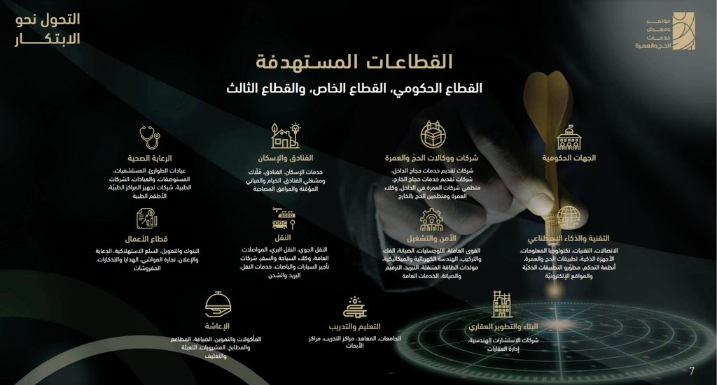 منظومة #الحج_والعمرة من اكبر المنظومات التي تتقاطع مع معظم الاقتصادات والمؤسسات الحكومية والخاصة و #التحول_نحو_الابتكار في الحج الذكي فرصة نحو تعزيز الإبتكار في التقنيات والاليات والانظمة في كل اذرع منظومة الحج والعمرة (النقل، الصحة، الاعاشة .....) لتحسين رحلة الحاج والمعتمر.