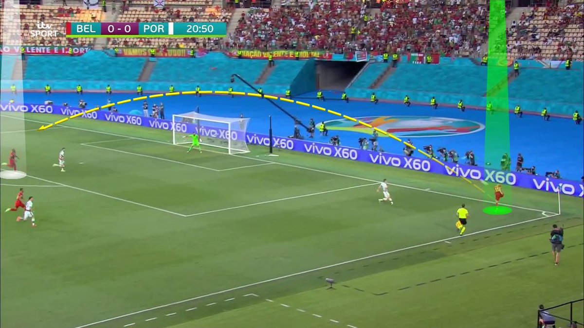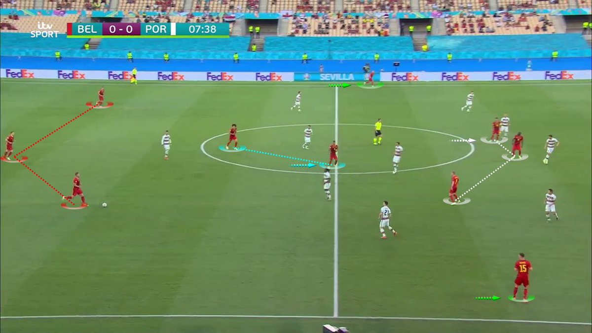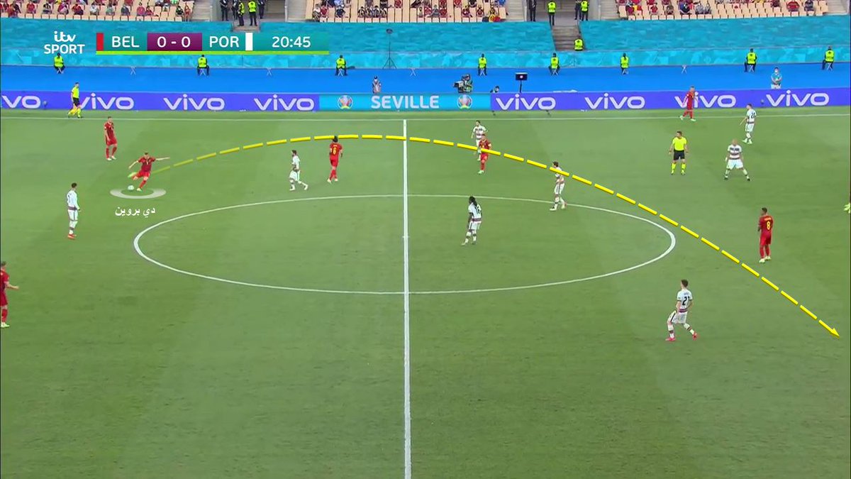 حالة أخرى توضح انتقال الكرة من ثلث لاخر، عبر اللعب بين الخطوط، واعتماد التمريرات العمودية الكاسرة للخطوط #EURO2020 | #BEL