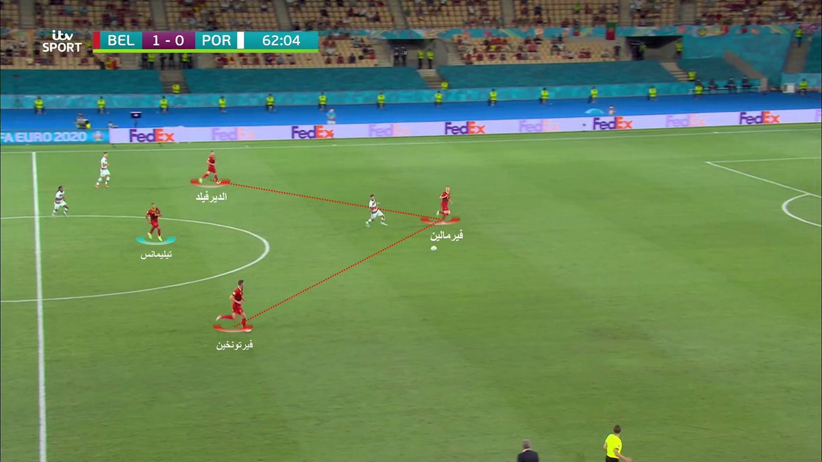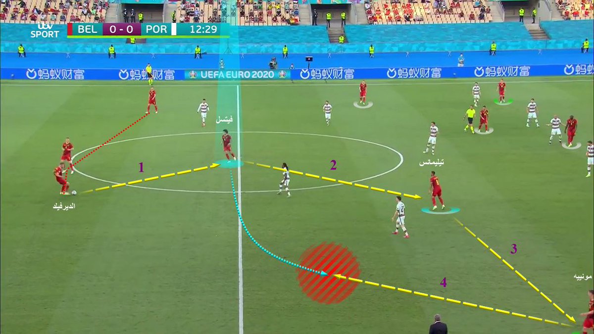 صعودة وزيادة الاظهرة ' مونييه و تورغان'، وواحد من لاعبي المحور ' فيتسل'؛ اصبح لدينا ٦ لاعبين في الامام، خلفهم تليمانس ' لاعب محور' يؤمن عمق الوسط، وفي الخلف قلوب الدفاع الثلاثة وصلت الكرة ل مونييه، مررها الى تورغان؛ سددها قوية في الهدف #EURO2020 | #BEL