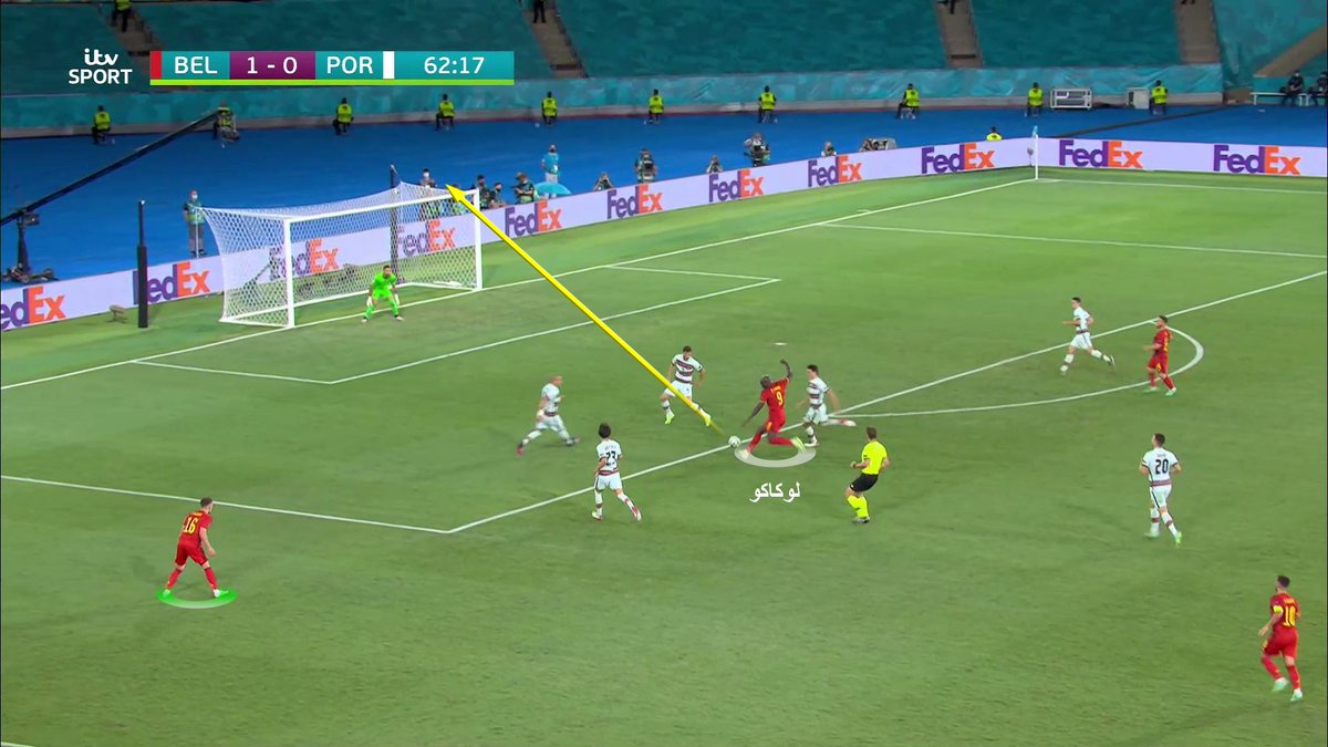 واحدة من الأفكار التي أعتمد عليها روبرتو مارتينيز وتكررت لأكثر من مرة هي أرسال كرة طويلة في الامام على الاطراف وبالتحديد للظهير او الجناح الأيمن مونييه ثم يتبعها تمريرة عرضية على رأس لوكاكو هنا 👇 مثلا من فيرتونخين إلى مونييه ثم عرضية إلى لوكاكو #EURO2020 | #BEL