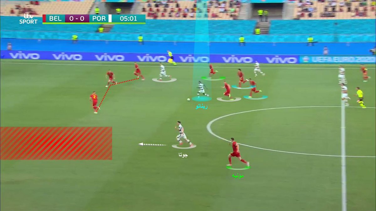 الفريق في حالة هجوم، مونييه يفتح عرض الملعب ويبالغ في التقدم للامام؛ هازارد يخسر الكرة، ريناتو يقود الهجمة ويمرر لجوتا في الفراغ #EURO2020 | #BEL