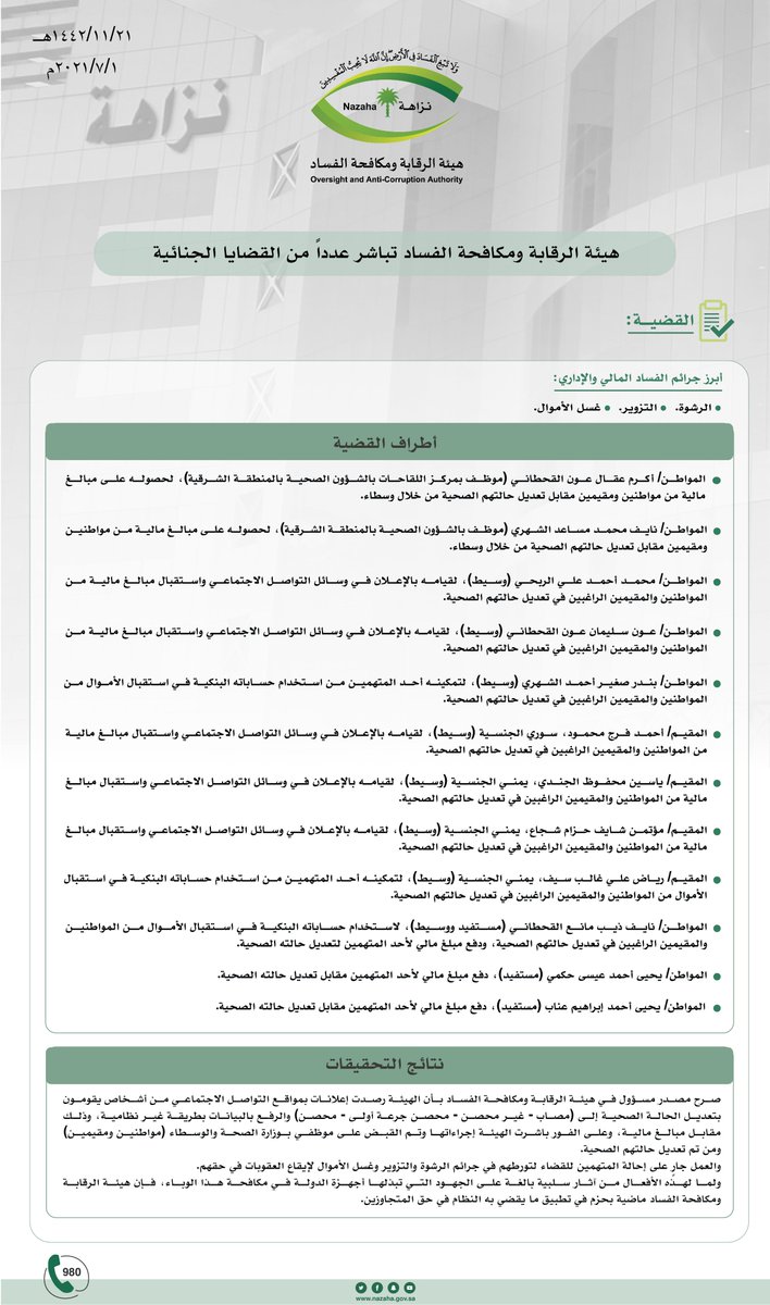 صرح مصدر مسؤول في هيئة الرقابة ومكافحة الفساد بأن الهيئة رصدت إعلانات بمواقع التواصل الاجتماعي من أشخاص يقومون بتعديل الحالة الصحية إلى (مصاب- غير محصن- محصن جرعة أولى- محصن) والرفع بالبيانات بطريقة غير نظامية، وذلك مقابل مبالغ مالية، وعلى الفور باشرت الهيئة إجراءاتها