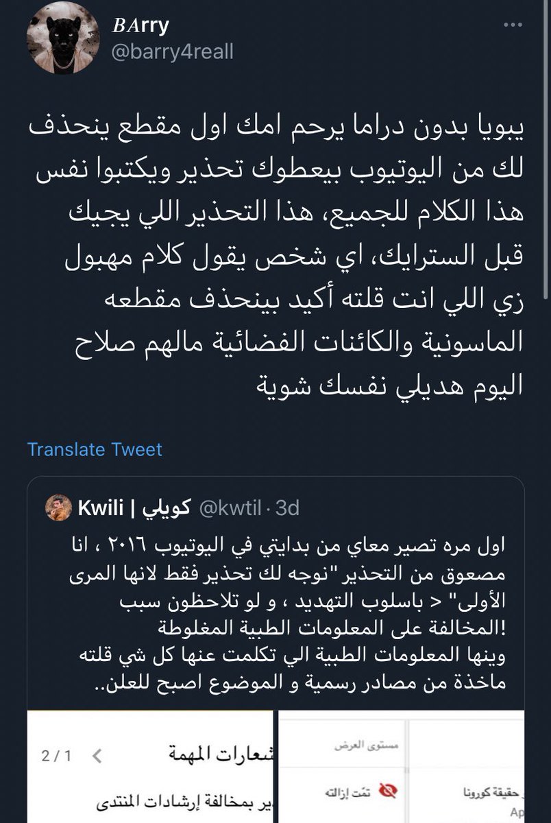 باري قال ان كويلي بكلامة انه "ماحياخذ اللقاح " لانه ممىت بيخرب عقلية متابعينه وبيخليهم مايستخدمون اللقاح ! .. وهذا بيسبب ضرر كبير وبيخلي الناس يسحبون على اللقاح !!!