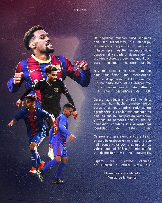 كونراد : أينما ذهبت سأشارك الجميع القيم التي غرسها برشلونة في داخلي مع الكثير من الحب والتفاني ، امل أن تتقاطع طرقنا مرة أخرى ذات يوم ، ممتن للأبد ، كونراد دي لافوينتي