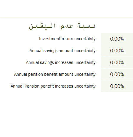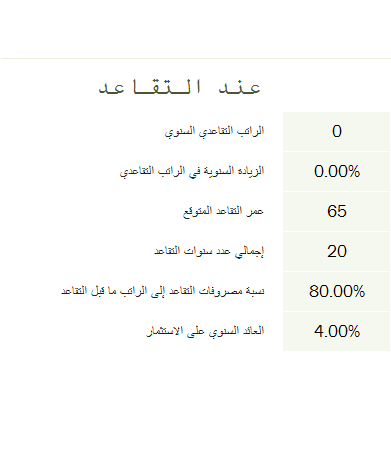 6. ثم ما هي مصروفات التقاعد بالنسبة إلى الراتب الأساسي أثناء العمل؟ يعني إذا تقاعدت، كم تبغي يكون مصروفاتك السنوية؟ أنا افترضت 80% من آخر راتب بس تقدر تفترض اللي اتشوفه وحتى أكثر من 100% إذا بغيت تلف العالم وتلعب غولف كل يوم.