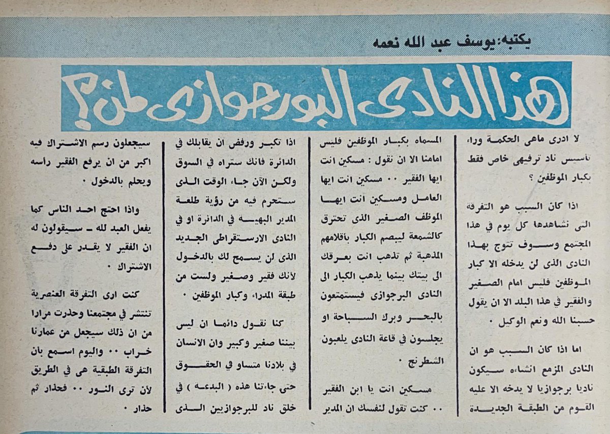 "كنا نقول دائمًا ان ليس بيننا كبير و صغير و ان الانسان في بلادنا متساو في الحقوق حتى جاءتنا هذه البدعه في خلق ناد للبرجوازيين"